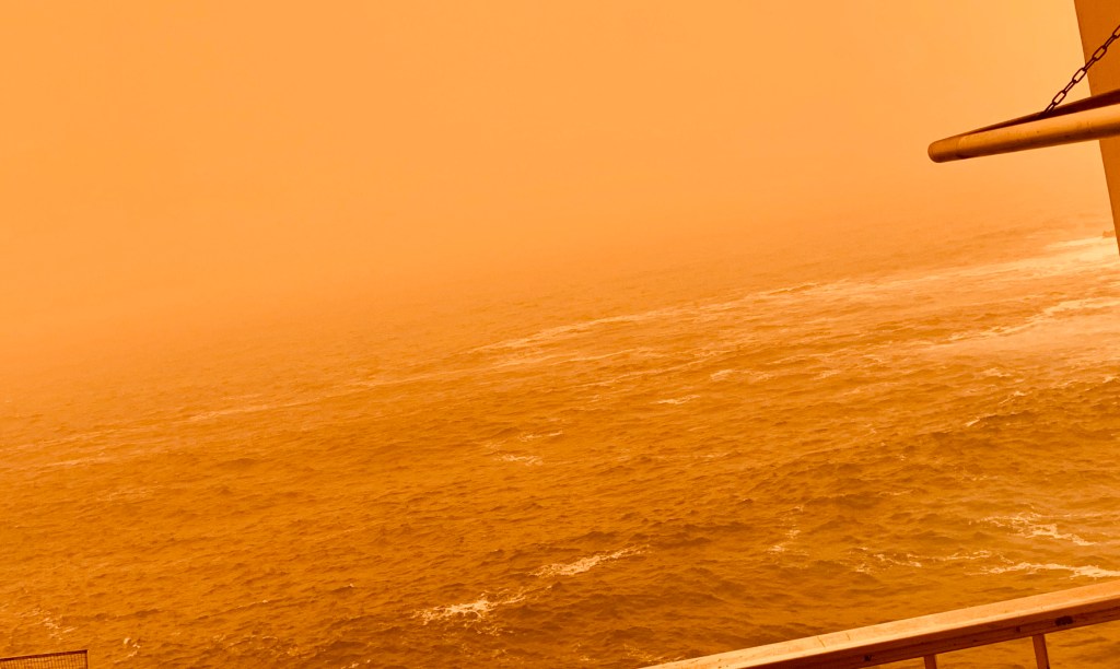 Alas, the day before we were to leave for Santa Cruz, a huge windstorm ( Calima ) swept the entire island. Our view went from pristine blue to an odd apocalyptic red haze. We could barely breathe and spent the day inside.