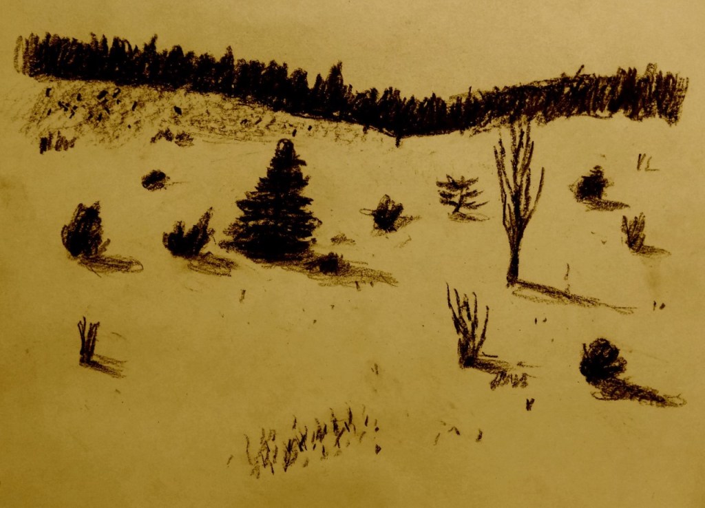 I am not known for my tendencies to be a Pollyanna, but I assured her, I shall be as bright and positive as possible given the circumstances. Initially, I thought I could write about the trails through the forest that we cover on nearly a daily basis as we walk our dogs. I often take my sketchbook with me as I walk and my two pups patiently wait for me in knee deep in snow while I finish my drawing. I think one day they will suffer frostbite for the sake of my art.