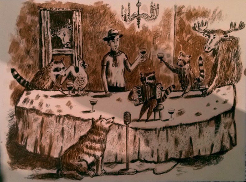 But as always when I am trying to create, whether at the easel or at the keyboard, I look for distractions, so trails aside, I take a mouthful of the aforementioned red wine, it is Stags’ Leap, a glorious cabernet sauvignon from the Napa Valley. I turn my head to examine a squirrel on a snowbank only feet from the dining window. What is he chewing on… I access the CBC on my computer for a little background music only to hear the staccato voice of a news reader telling me that by mutual agreement, Canada and the USA have agreed to close the border. Like most people, I’m beginning to feel I’m living in a science fiction movie.