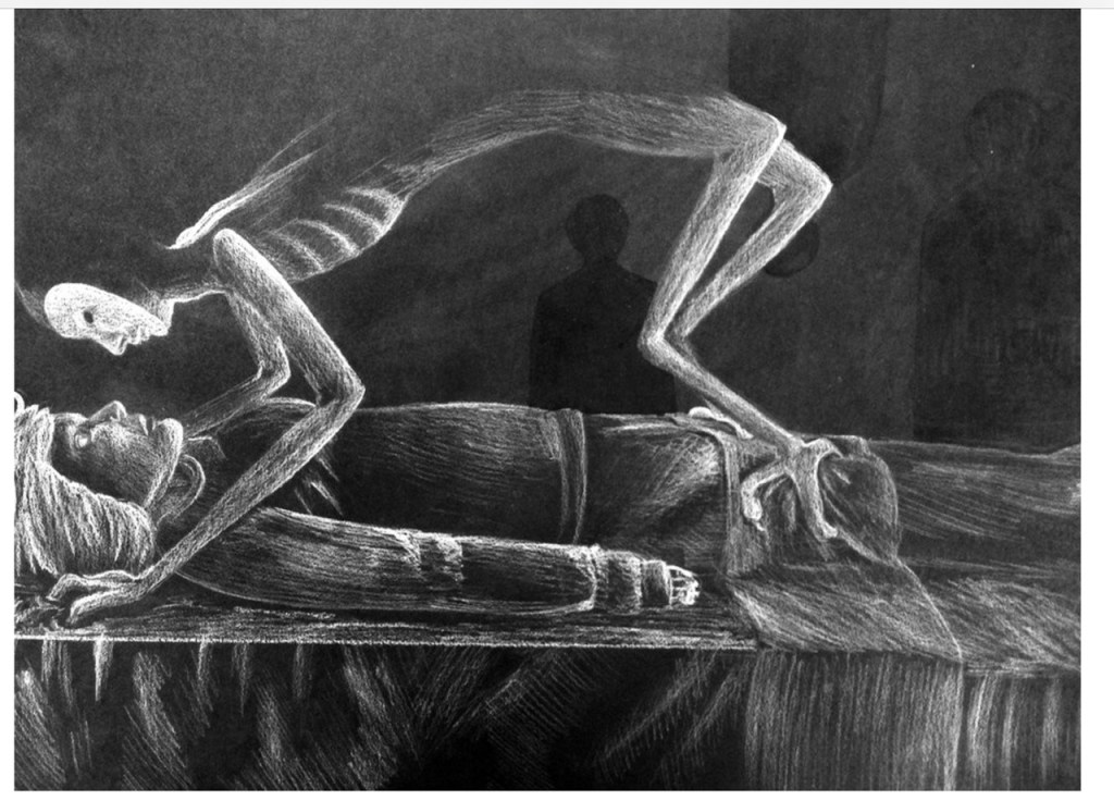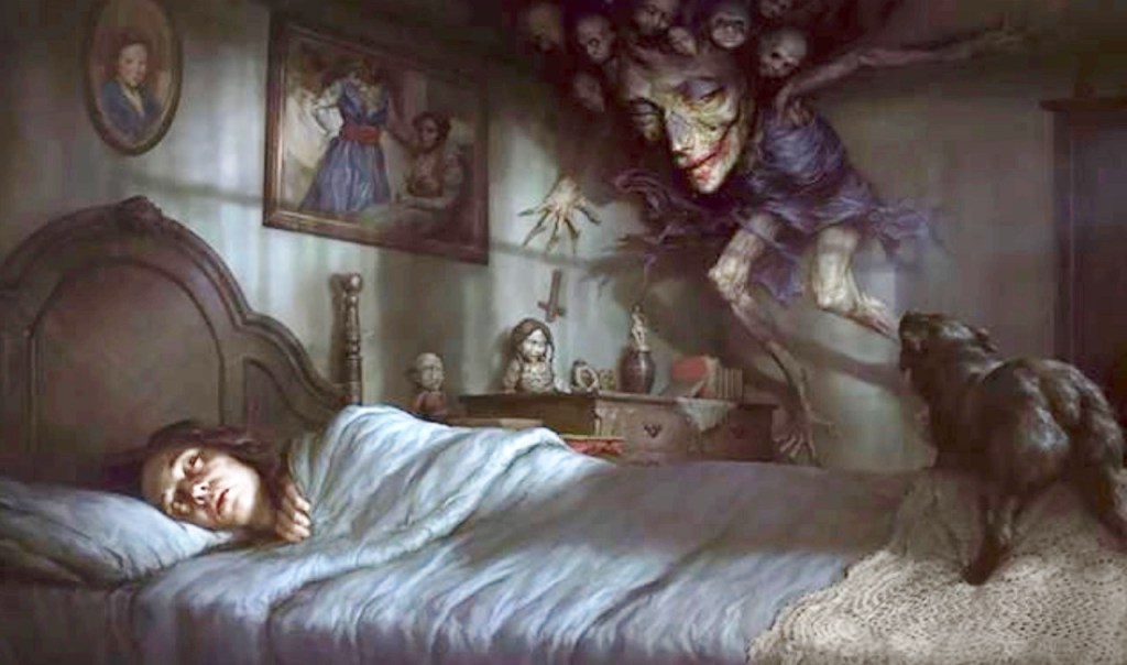 On sleepeducation.org, I learned that during sleep paralysis, “you’re suddenly completely unable to move. Your body becomes paralyzed as if an unseen weight is upon you. Episodes can cause intense anxiety. Sleep paralysis may occur together with hallucinations. You “wake up” but your brain is still dreaming and projecting your nightmares into the real world. You’re paralyzed while having hallucinations. You may imagine you see or hear something or someone and that something or someone is in the room with you. Across cultures the terrifying sensation of sleep paralysis has evoked vivid descriptions going back centuries and has often been called Old Hag. Stress is usually a factor and this most commonly happens to people in their twenties going through emotional turmoil.”