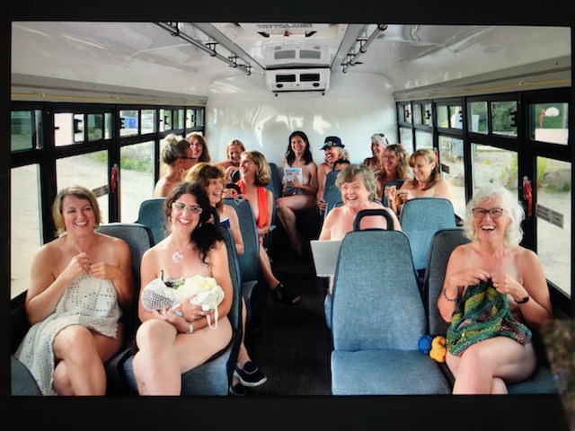 It must have been around 6:30 or 7:00 pm by then, and the sun was dropping a little in the sky. All of a sudden, Franziska decided that the light was wrong, and that we needed to move the bus. But we were naked, and our clothes were under the hedge. After some debate, a brave volunteer was dispatched to waddle across the car park in her flip flops, wrapped in a small towel, to ask the driver if he would kindly turn the bus around. Again, it seemed as though to him this was nothing in a day’s work. Over he came, without batting an eye in our direction, started up the engine, and drove a bus load of naked women to the other side of the car park, before heading off for another smoke.