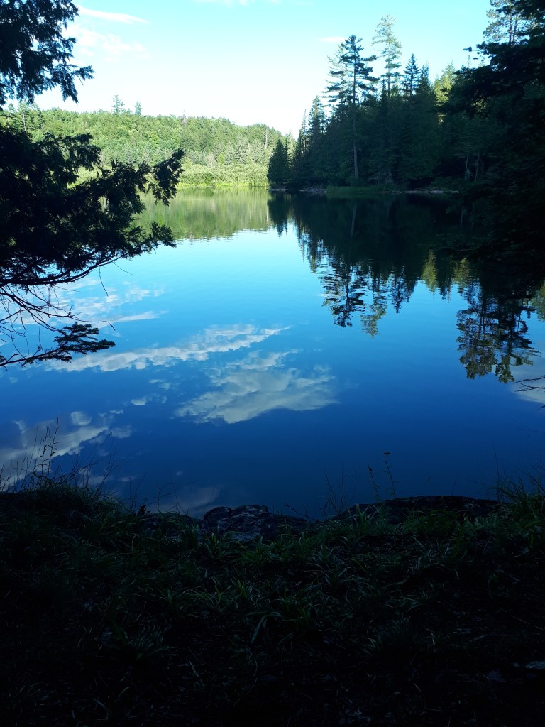 Most days we were alone, amidst rocks as old as time and trees as magnificent as their predecessors; weeping aspens, maples, cedar, pine, birch and hemlock. We would begin our swim heading to one of three vantage points where we could enjoy an open vista of the entire lake. Passing one of two beaver damns depending on our destination, we glided through the water with water bugs swimming in circles around us and dragonflies dipping in and out of the water, their iridescent turquoise wings glimmering in the sunlight.