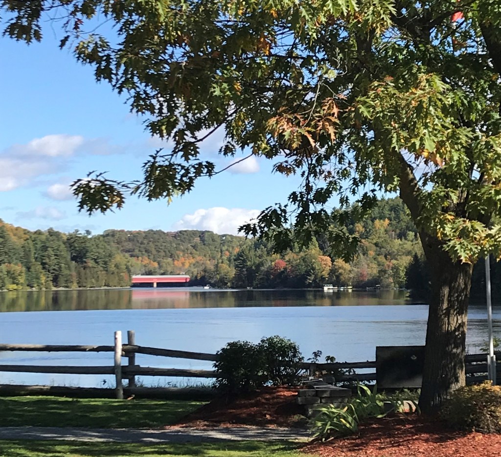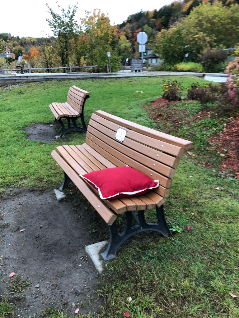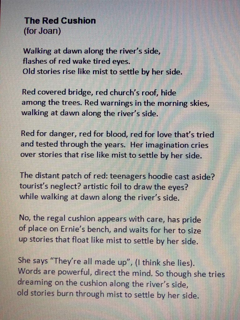 This past summer my early morning walks along the river made me reconsider my relationship with red, thanks to a chance meeting with a cushion. Not every morning, but often, as the dog and I padded towards Peace Park, I would catch a distant glimpse of red. As we got closer, the red splash would take shape and appear as a cushion, on the bench dedicated to Ernie Mahoney. The dog and I were fascinated. It was a beautifully crafted object, made of red brocade, sturdy, with a cream braid around the edge, not something one would casually leave behind. Whatever the particular light of the morning, it played off the red church roof, and turning the other way, the distant covered bridge. Clearly, it had been placed carefully, intentionally, but for what purpose? I touched it gently; it was never cold, never damp from the morning dew and according to the dog, smelled just right too.