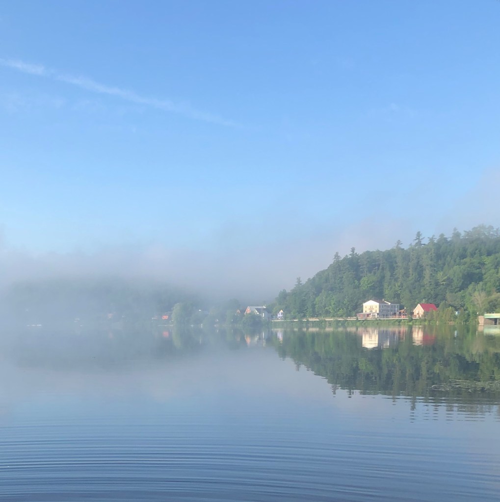 I walk early every morning, often along the riverside. It is one of the huge delights of living in Wakefield. Every morning is different. The river can be sleepy, shrouded in mist, or bright and excitable, or grey and choppy. The sky too, each morning has its own emotions going on. They feed my mind, so that whatever story I’m mulling over, there is another voice colouring the narrative. But whatever the internal dialogue of the day, my eye is always drawn to the splashes of red that punctuate the horizon: the covered bridge, the red roofs of the church and the village house, the Banque Nationale sign.