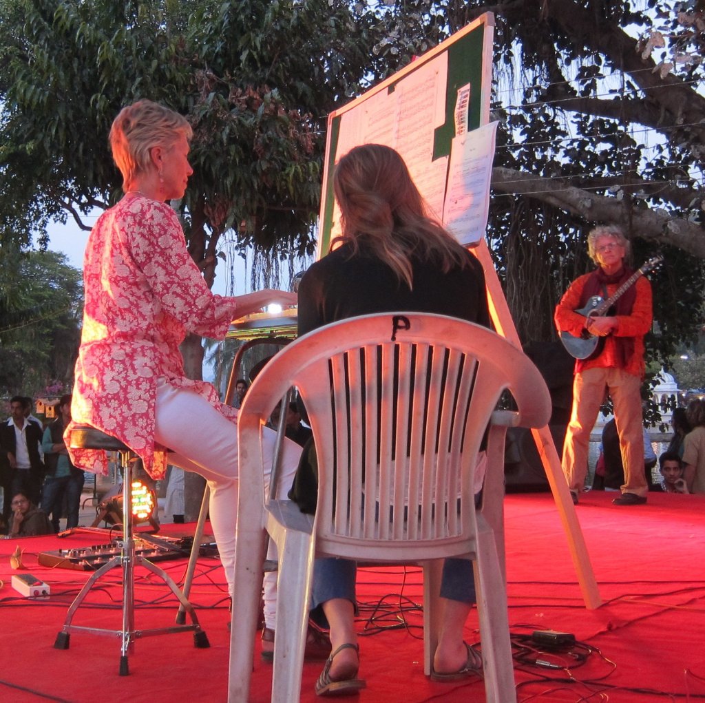 I started to suspect the sound check would go the way of the schedule . . . lost in space. Looking around, I spotted some players from last night’s jam, including Anna, the young woman who’d been sitting at the keyboard. Like many young westerners, she was happily wandering through India with no itinerary or angst. Hanging around the music scene at the Anarki was her latest diversion. No pillars of expectation stuck to her!