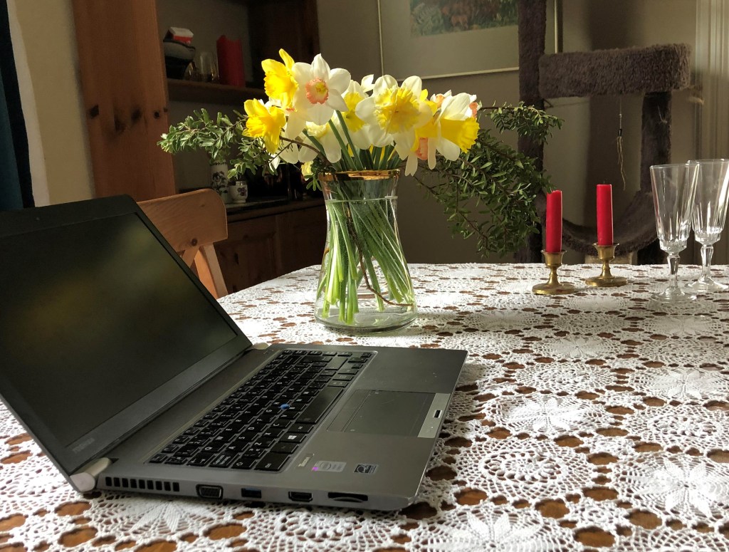 This wasn’t the first wedding we couldn’t attend. We had been invited to my research fellow’s wedding in Vancouver last May. That time it was live-streamed via Facebook. I placed a bunch of daffodils by the laptop, and we stood weepy-eyed as we watched the ceremony unfold in Stanley Park. And then our nephew married in Germany and shared the briefest of clips of himself exchanging rings with his fiancé.