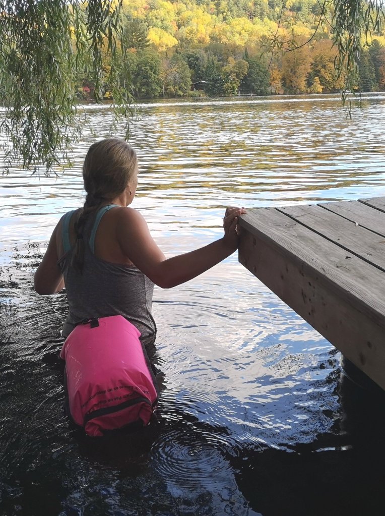 We walk with jittery anticipation. It is October 9th – a new record for both of us. Whether it’s our shared Nordic ancestry or just getting to that age where challenging oneself feels almost necessary, we are surprising ourselves with our interest in plunging into the river far past our usual summer dips.