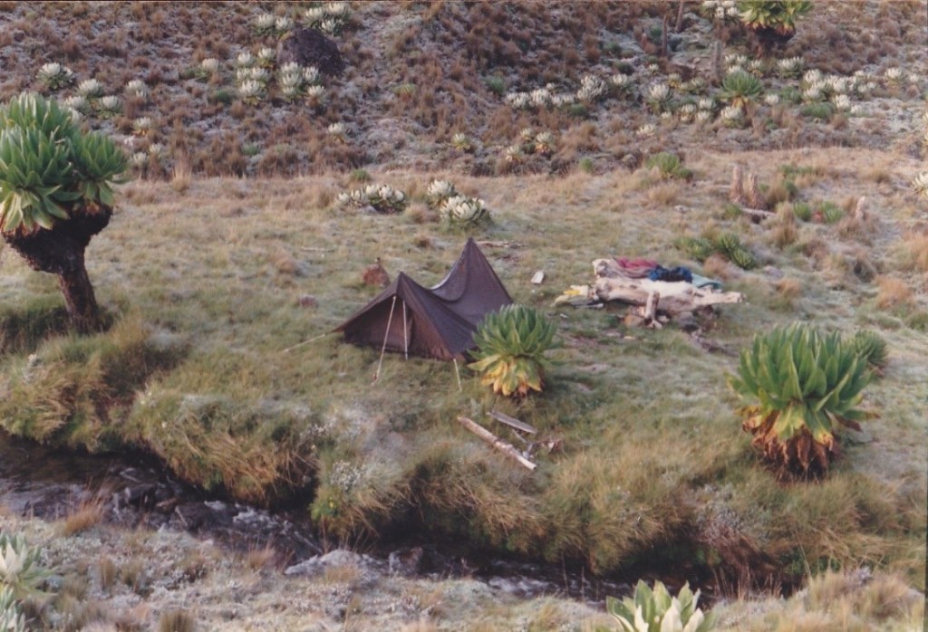 Linda began complaining of altitude sickness (AMS) symptoms. First a headache, then nausea and then tossing her cookies. I was worried for her but we had no food to spare! Aspirin and frequent rest stops didn’t help her despite a lighter pack load (a porter took one of her packs down the mountain). Soon after, a couple of entrepreneurial porters told us we were still about 3 hours from our destination (Mackinder’s hut). Linda was feeling even worse by then and talking about abandoning the trek altogether. I proposed we head for the lowest elevation (without serious backtracking) and set up camp for the night and see how she felt next morning. Thankfully she agreed and we began our scramble down the steep hill to the Teleki river about 1 km below. I saw a huge bird sitting on a giant lobelia tree and it refused to budge as we approached it. Like a beacon, the Mackinder eagle owl with huge orange eyes, never left us and seemed to guide us to the perfect spot.