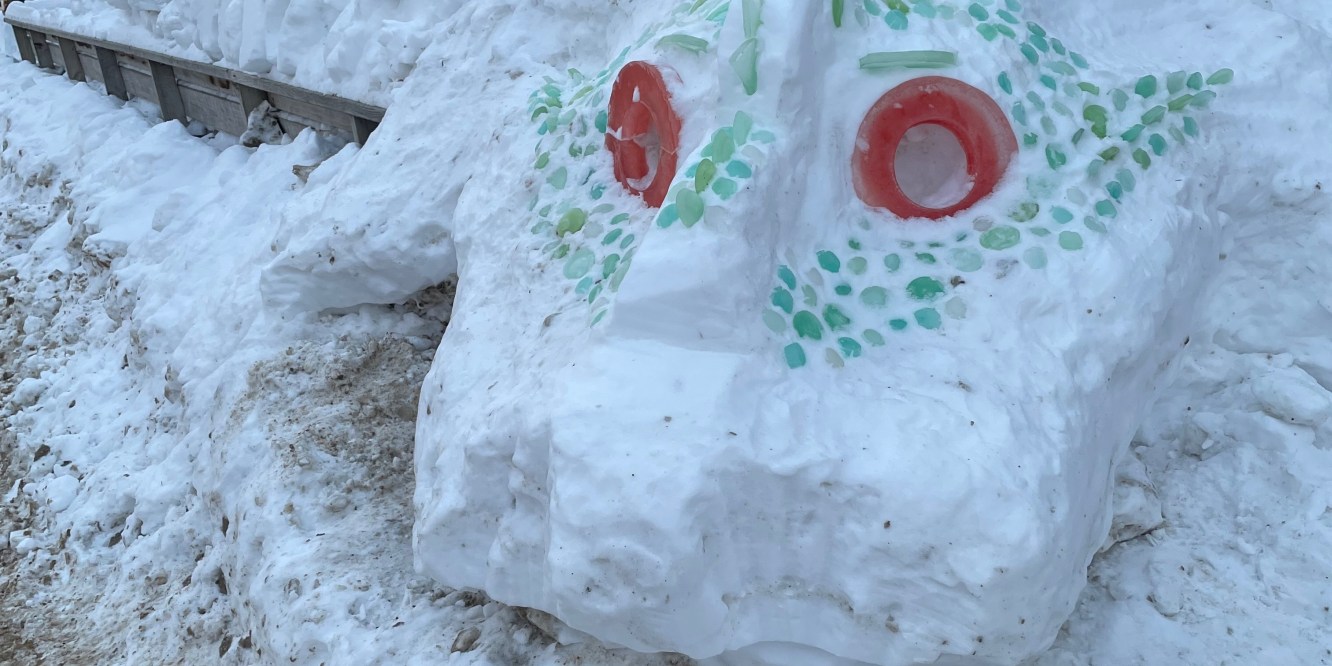 Ms. Winter: Every year humans lay their hands on the young dragon to show their love and play with them to show that we are family. Sometimes the dragon has their BACK UP and makes themself look big, sometimes they blow fire from their nostrils, colourful fire. Dogs pee on them, birds rest or scan the territory from their scales. But as the days get longer and the sun stronger, the snow dragon begins to warm and so has to sink back into the earth to stay cool.
