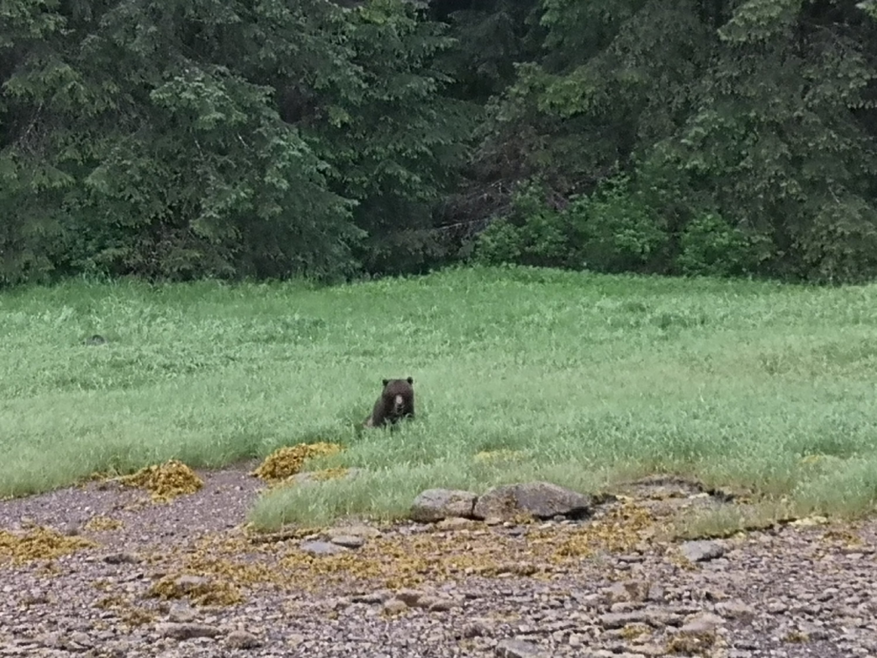 After an hour or so on open ocean the engine slows. The force of the wake behind us catches the boat and carries it forward. We drift. The engine cuts to quiet and we move slowly into the first inlet. Binoculars ready, all warned not too talk, we idle forward. Very soon thereafter we see her — we see them. A female and cubs are on the beach. I can not believe my eyes. They continue, unfussed, to eat sea grass, to turn stones and to frolic… like young bears clearly do. I feel my throat constrict. True, unadulterated, natural beauty.