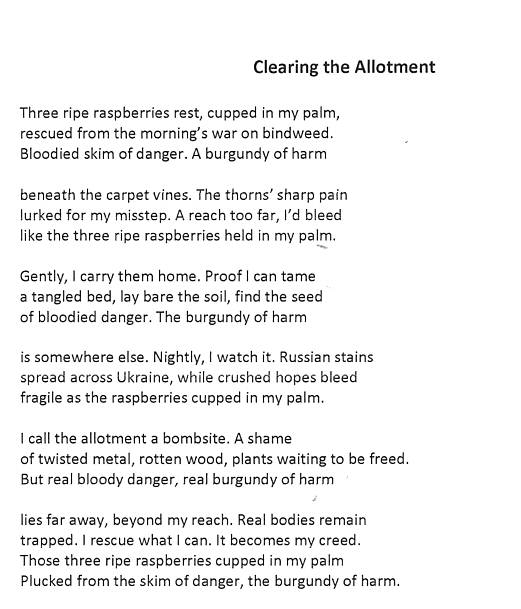 I had spent the morning in the allotment, a new acquisition for my son and his little family. In the few spare days left before flying home to Canada, I offered to tackle clearing the beds of bindweed. I worked away in the morning sun, repeatedly ripping my skin on brambles and hidden rose bushes.
