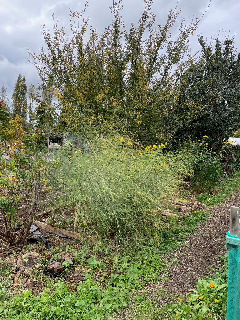 During the morning, fellow allotment holders stopped by and filled me in on the rules and regulations (no bindweed in the compost bin!), and a bit of the history of the plot. I learned that this plot had been one of the best in the area, which strengthened my resolve to kick-start it back on the road to recovery. Bordering one side were fruit trees: apple, damson, and plum. One woman, a recent immigrant to the UK, told me that she didn’t know that the plot was taken and had helped herself to apples from the tree, as she hated to see all that fruit going to waste. She told me she lived in a nearby high-rise block of flats (apartments) and how she loved coming here, so she could grow her own food, in peace.