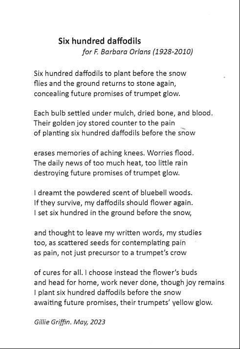 we carried on talking, of course, and she did carry on writing, sending me essays and book chapters to read for her. I never asked her “Why six hundred daffodils?”. Maybe, it was just the number of daffodils she thought would fill a particular space in her garden, but I suspect she had some other, deeper reason.