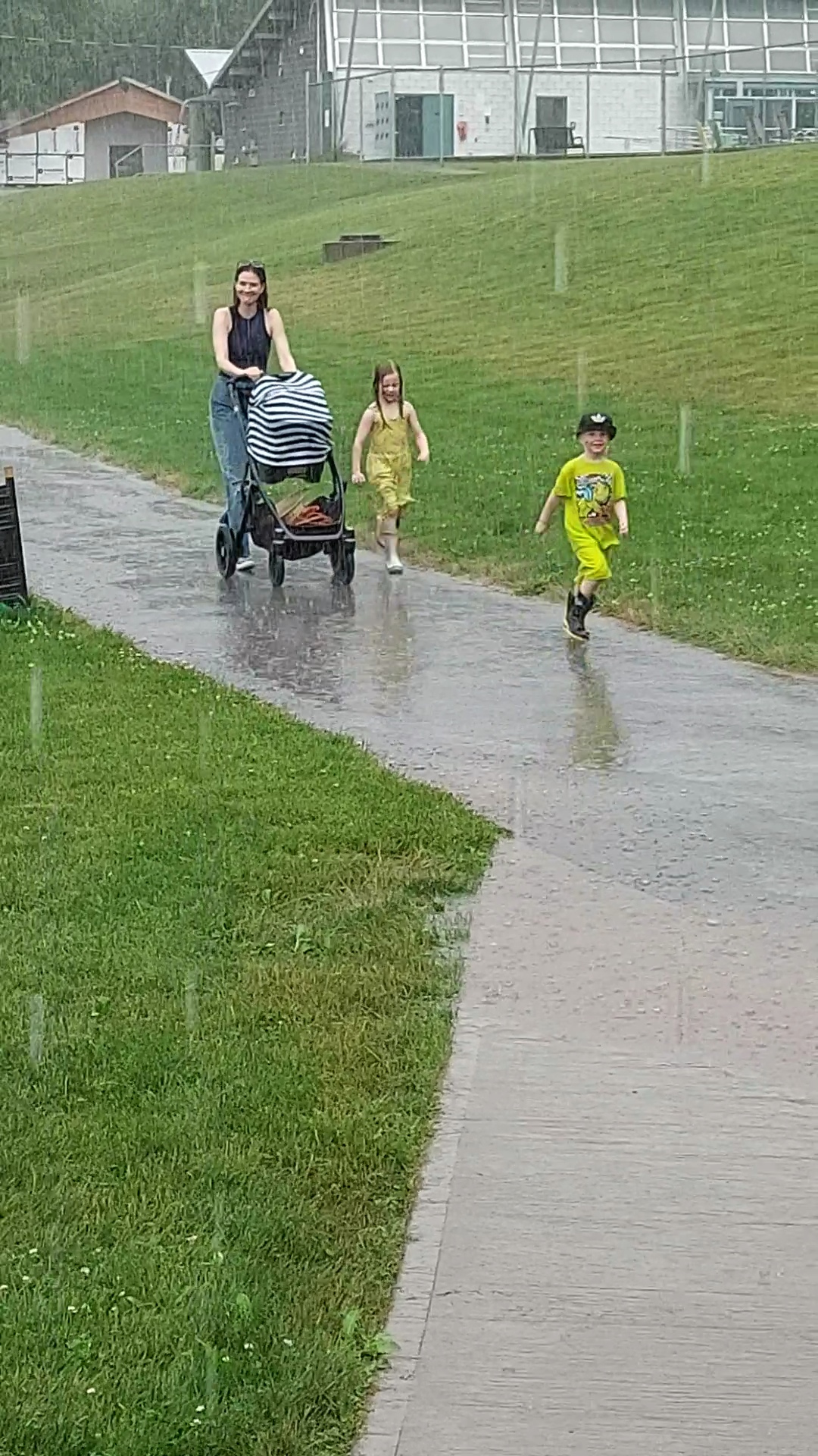 Just before the presentations began, my daughter arrived with her children and I was so pleased she was able to join with a few other great-grandchildren in attendance. Danika, Connor and Molly, Saskia’s troika were the only great-great grandchildren present. As the speeches commenced, Saskia thought she would keep the kids quiet and set off to the lovely play structure across the field. I had warned her about a dark cloud looming but she thought she could beat it. No sooner had she gone half way to the playground but the heaven’s opened and the rain poured down! Saskia and the kids were drenched. Saskia smiled sheepishly and the children were giggling happily as they splashed about soaked by the summer rain.