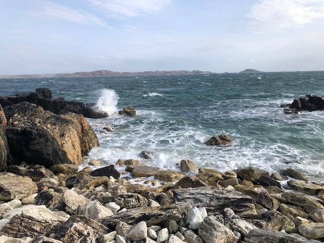 We drove foot to the floor on the single-track road. Storm Agnes was definitely gathering in might, and the atmosphere felt ominously threatening, but also somehow exhilaratingly enthralling. Even the sheep wandering around on the road seemed to have trouble staying upright. We finally got to the second ferry, and saw it trying to land, which was a bit of a challenge, but the experienced crew were far more used to bad weather than to calm seas, so we knew they would try to make one last crossing before Agnes summoned up enough power to interfere with their sailing. The boat landed finally, and a few shaken tourists wobbled off, while we delightedly clambered on. We could now see our destination beckoning across the narrow strip of unruly water. The boat had to fight with the vicious currents and the dominant wave crests, so we went slowly, swirling around somewhat in the brewing storm.