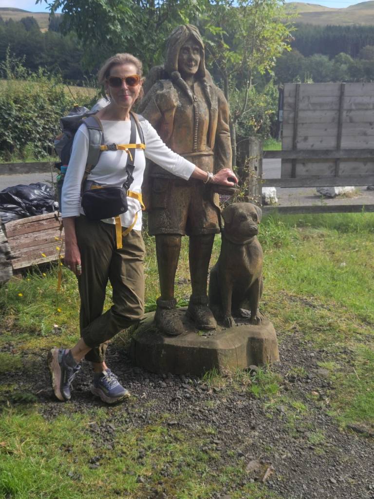 Further along at one of the milestones, I met my travelling companion Shelly at the foot of the Dumgoyne Hill. We stopped at the Beech Tree Inn and had coffee and a walk in their wildlife garden. As we got ready to leave I noticed one of the carvings as you exit to the road along which travels the Way. A life size wood carving of a young girl, pack on her back and a retriever sitting next to her. More than wishful thinking, I felt Rio was with me. He would accompany me all the way to the end. All the signs pointed to that. The walk was to be a celebration of life, his and mine.