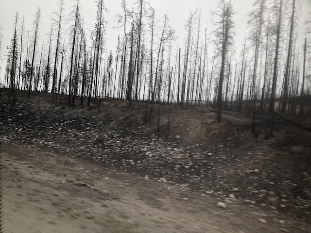 Lost in wonder and awe, we crawled into Jasper where I jumped off the trusty train once more, this time with my modest backpack on my back, and said my final goodbyes, as from here on in I was busing it to the West Coast. Meeting me at the station was the friend of a dear friend, who had lived in Jasper for over 40 years, and who was now a municipal counsellor. Her home and much of her community had been hungrily gobbled up by the ravenous forest fires of last year. She kindly showed me the beauty and the devastating horror of this unique place, where there are looming mountains, turquoise lakes, but also burned-out forests and many, many destroyed buildings and homes- including her own. Her entire possessions and family history now lay unsalvageable in a blackened pile of ash and flattened rubble. This was the same for so many – not just in the well-known and prosperity-heeled town of Jasper but also in smaller, less prodigious communities all over the country, including many First Nations Communities.****